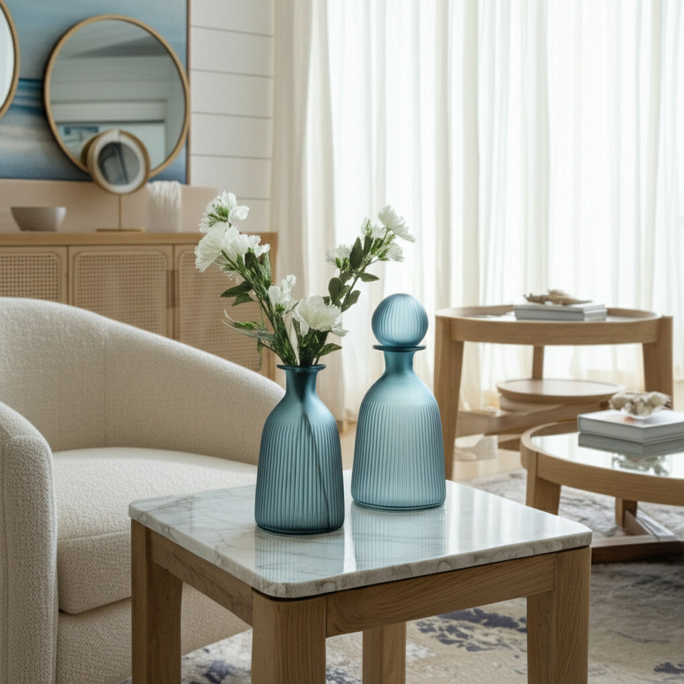 This 13" glass vase with lid features a dreamy blue and gray palette that adds sophistication and versatility to any room. Perfect for enhancing diverse interior styles and floral displays.