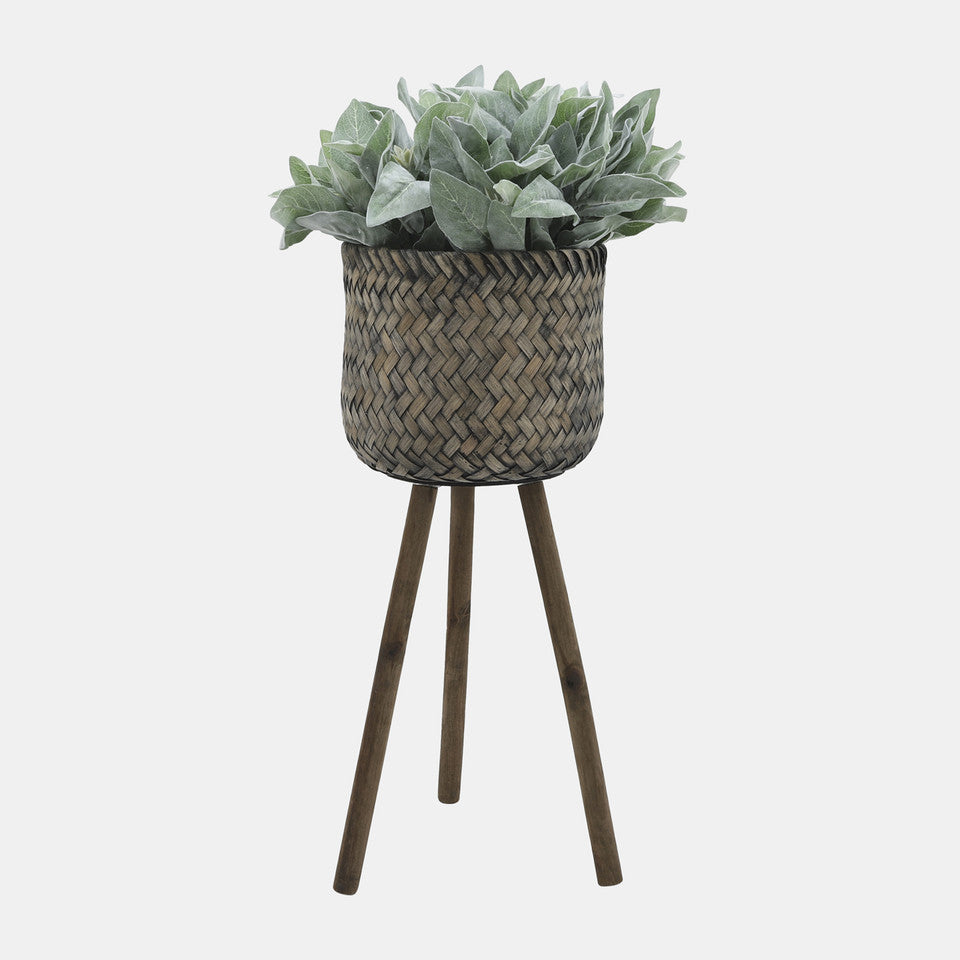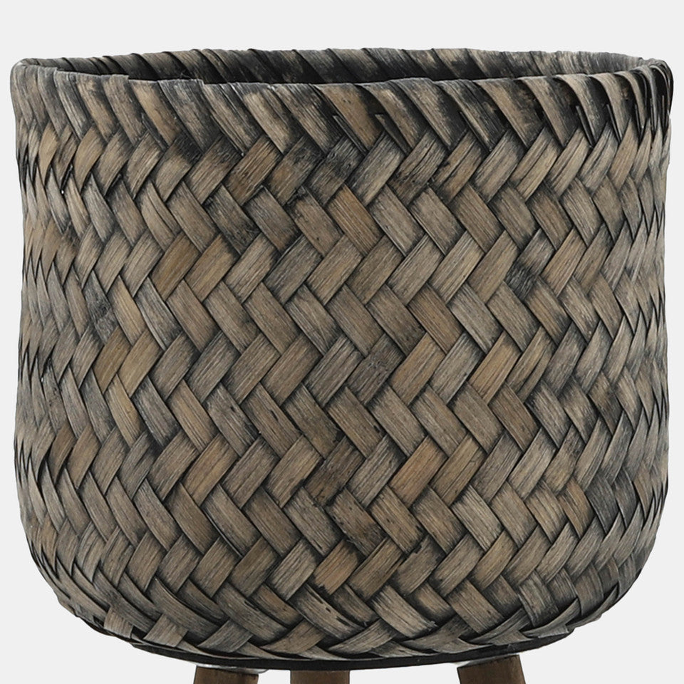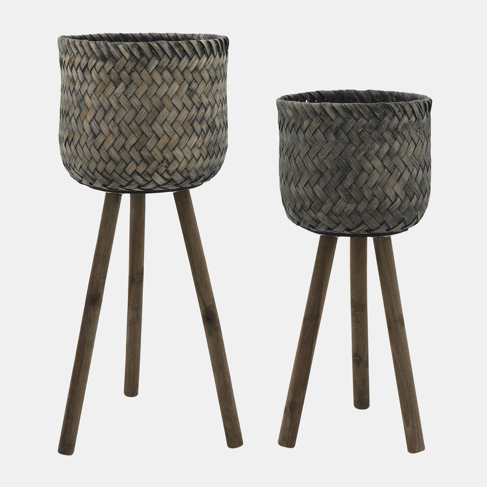 This pair of bamboo planters features a stylish woven netting pattern and stands on three wooden legs, offering a minimalist and elegant solution for displaying your plants.