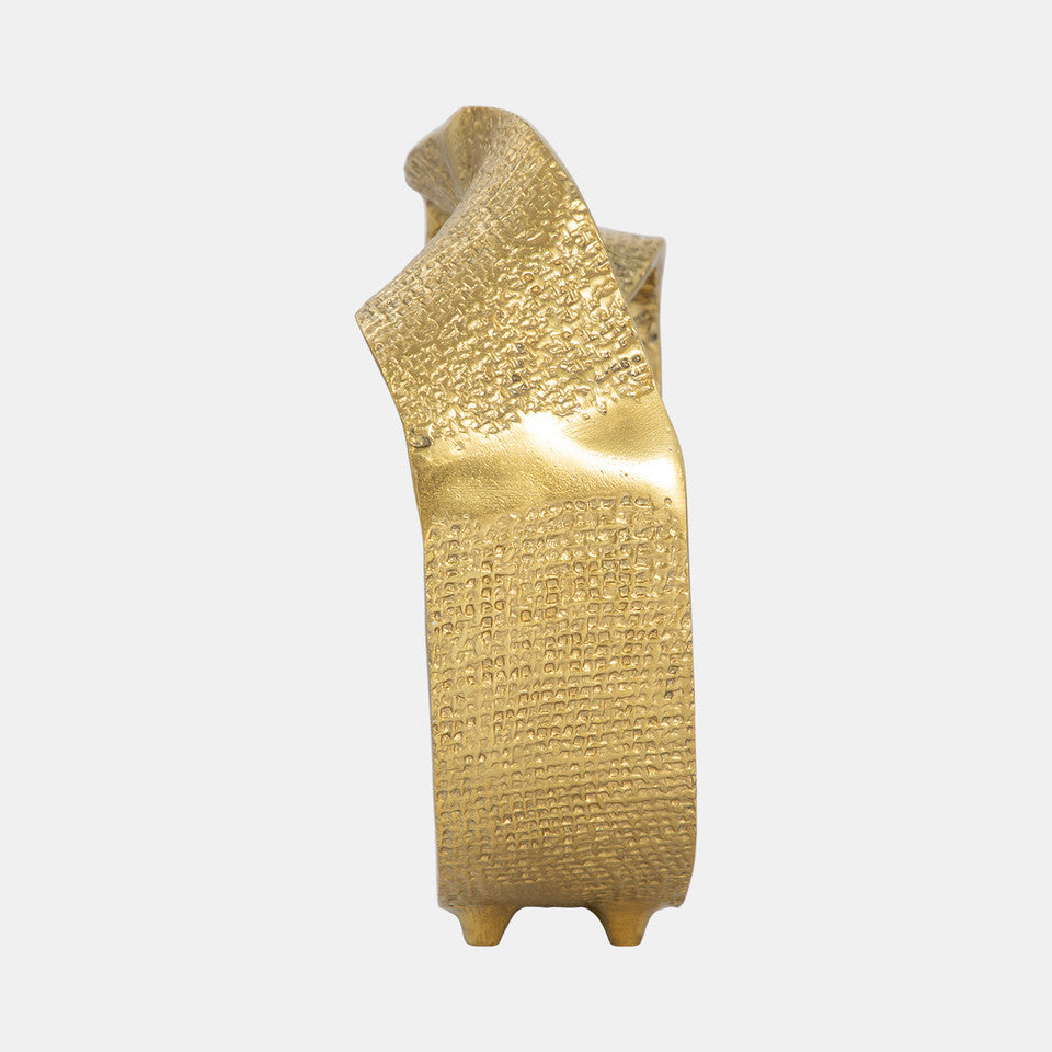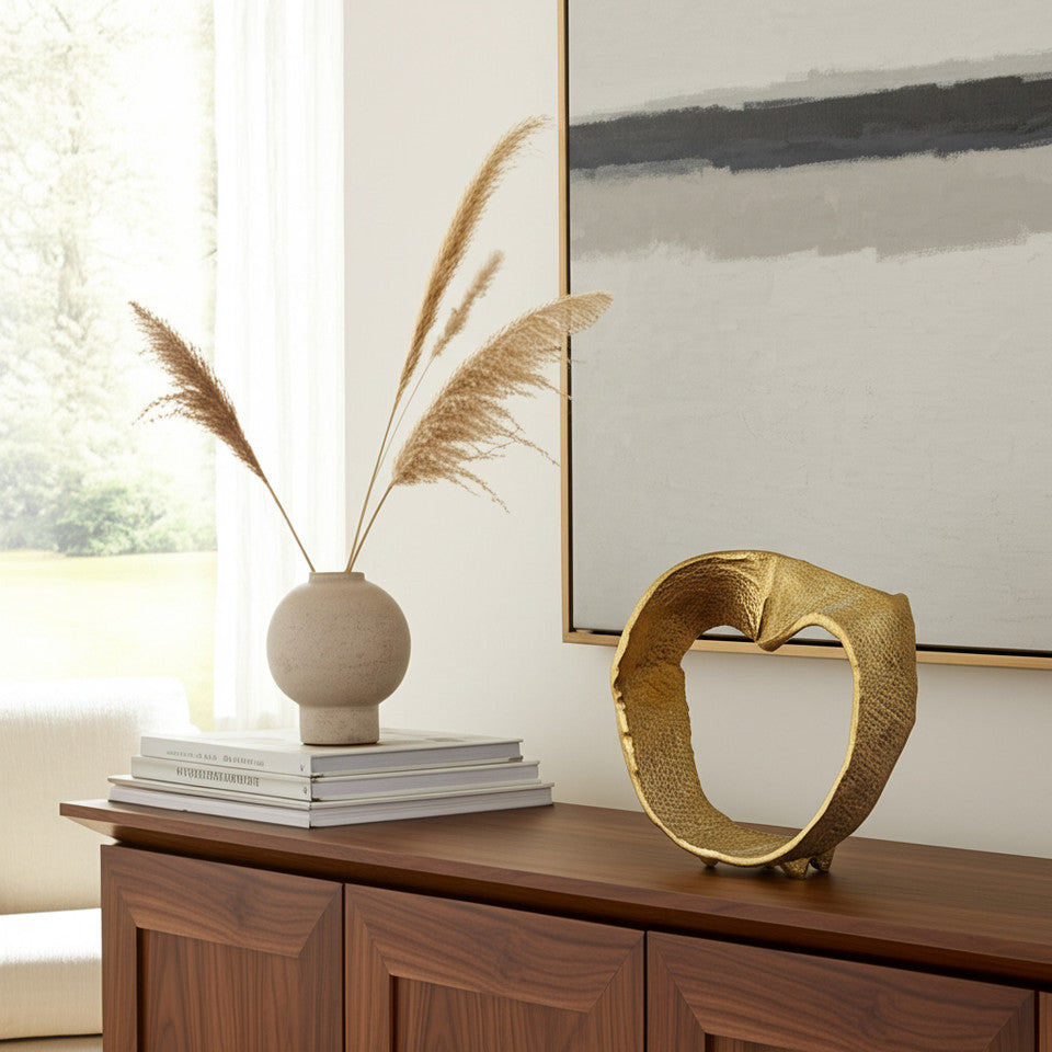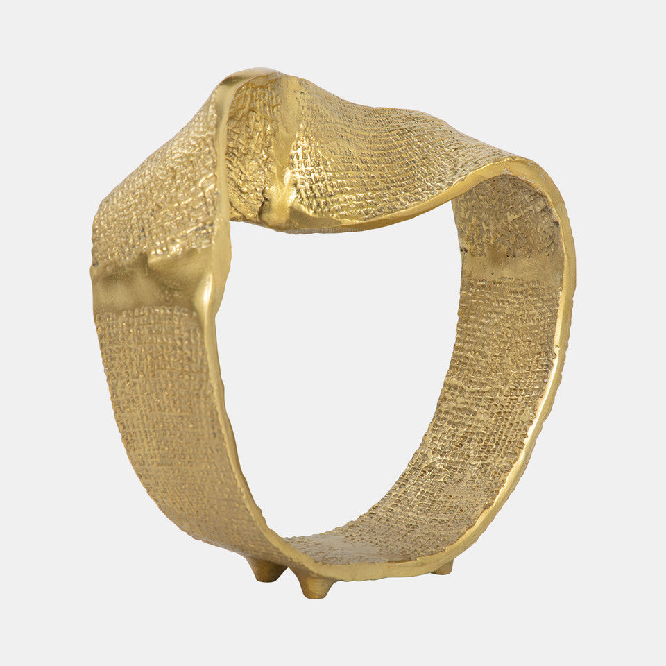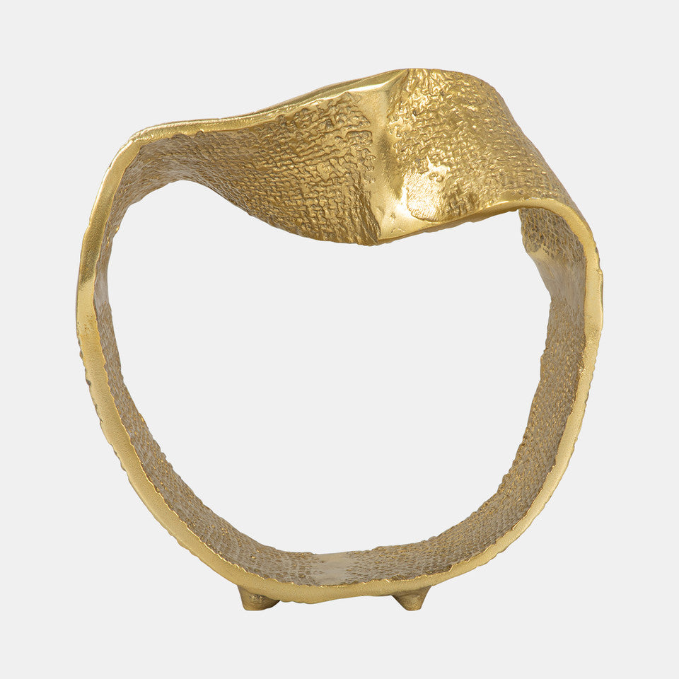 Elevate your space with the Twisted Hammered Ring 10". Crafted from aluminum and Suar wood, its gold metallic finish and modern design bring refined texture and warmth to any room.