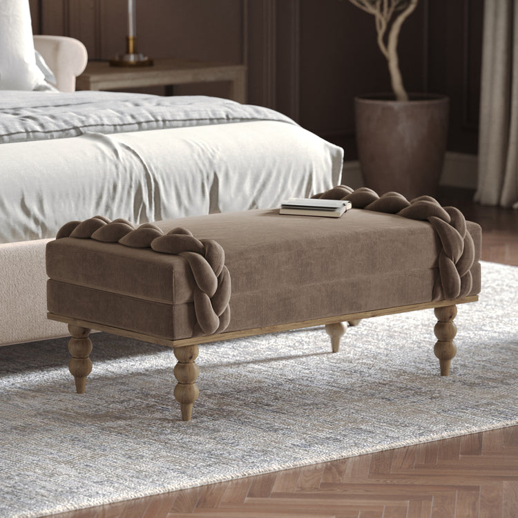 Crafted with timeless elegance, this artisan-made bench invites you to pause, unwind, and indulge in effortless comfort. With a solid hardwood frame, each curve and detail speaks of expert craftsmanship and beautifully braided fabric on each end enduring beauty. Whether placed in an entryway, at the foot of a bed, or as a charming accent in your living space, its graceful presence enhances any setting. Upholstered in luxurious performance fabric, this bench is not only a feast for the eyes but also a haven of relaxation. A perfect blend of sophistication and warmth, it’s where style meets serenity.